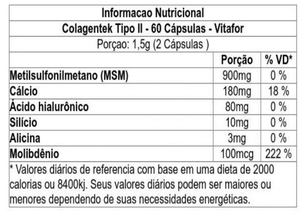Colagentek Vitafor é um suplemento alimentar à base de colágeno tipo II, metilsulfonilmetano (MSM), ácido hialurônico, extrato de alho em pó (Allium sativum L.) e minerais, com zero adição de açúcares.