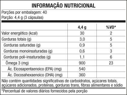 Contém 540mg de EPA e 360mg de DHA por porção (3 cápsulas).